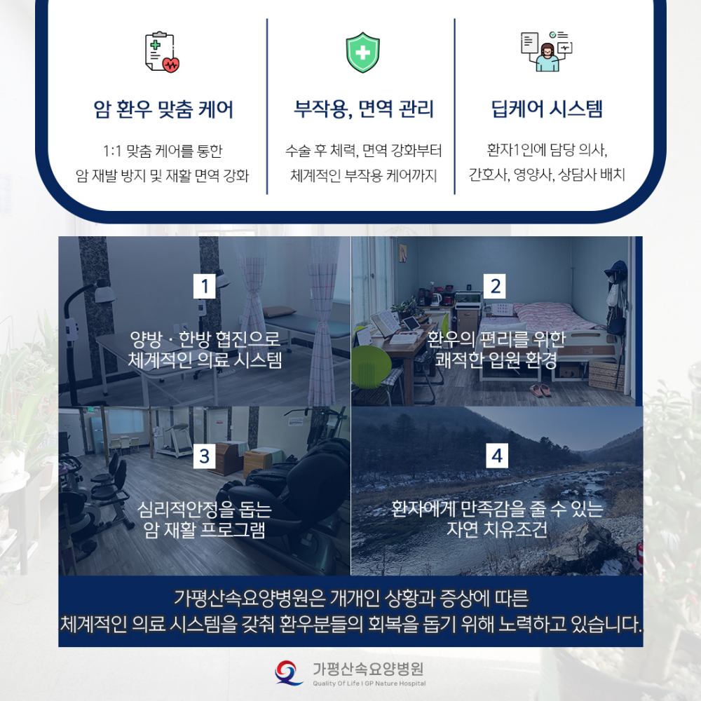 안녕하세요. 가평산속암요양병원입니다.최근 요양병원을 찾는 분들 중에서는 항암 치료를 받으며 부작용과 관련된 어려움을 겪는 분들이 많아지고 있습니다. 항암이나 방사선 치료는 치열한